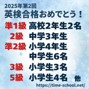 2学期期末テストが終わり、気分は冬休み・・・でも、あと1か月半もすれば総復習のテストです。学校は冬休みに入るので塾では冬期講習ガンバロー! いえ、TIMEでは冬期講習は行ないません。もちろん復習は行ないますし、 […]